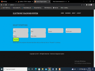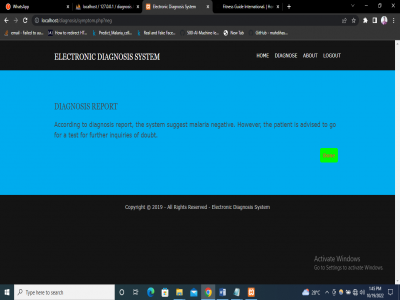 The aim of this research work is to design and implement an electronic diagnosis system that will be able to diagnose malaria patients in other to ease the stress of doctors and patients in hospitals.